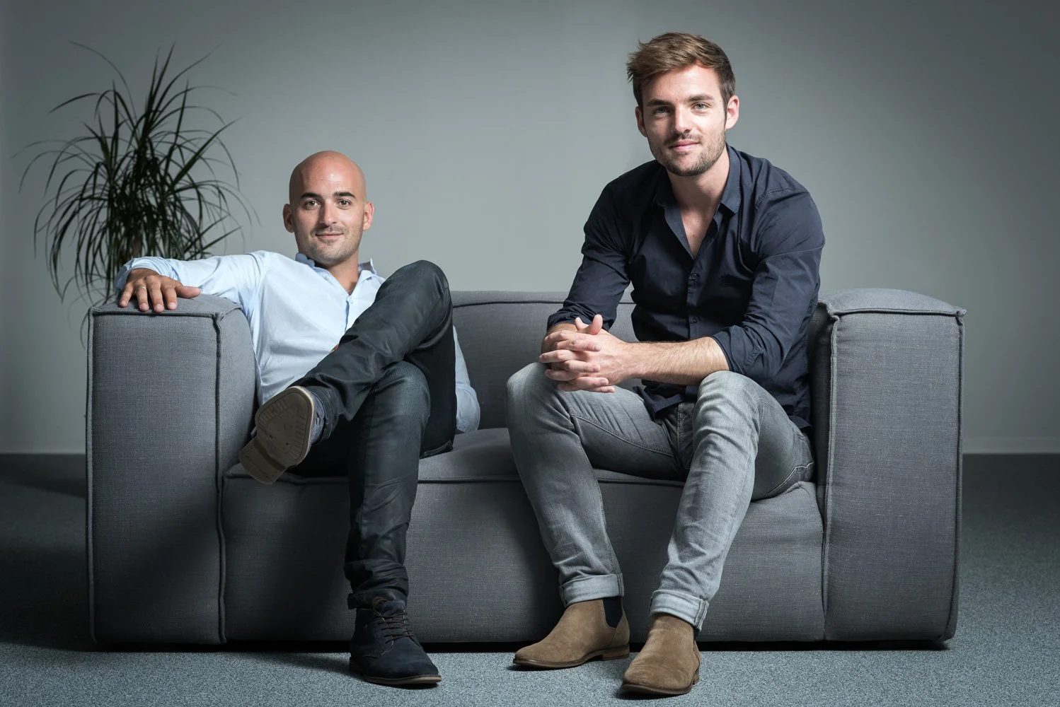 Deux hommes assis sur un canapé gris dans un intérieur moderne, un avec une chemise blanche et l'autre avec une chemise bleue, avec une plante verte en arrière-plan.